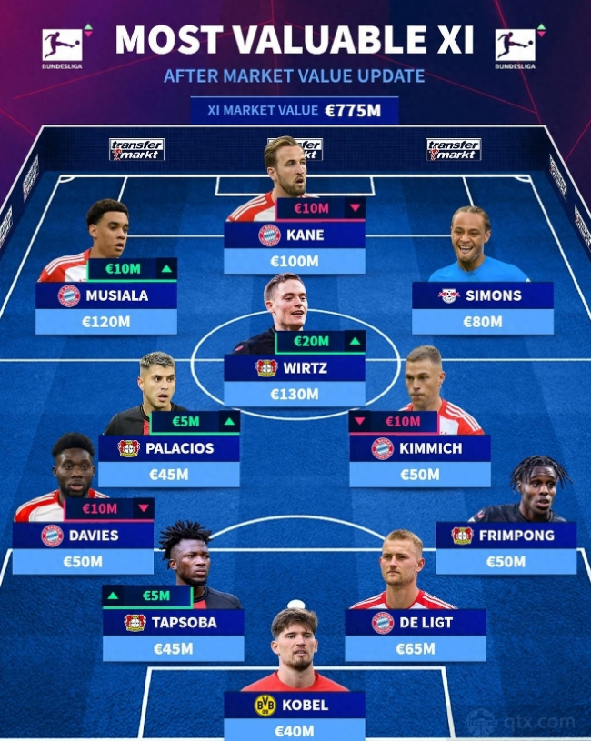 以下為德轉發布的德甲聯賽身價最高陣容: