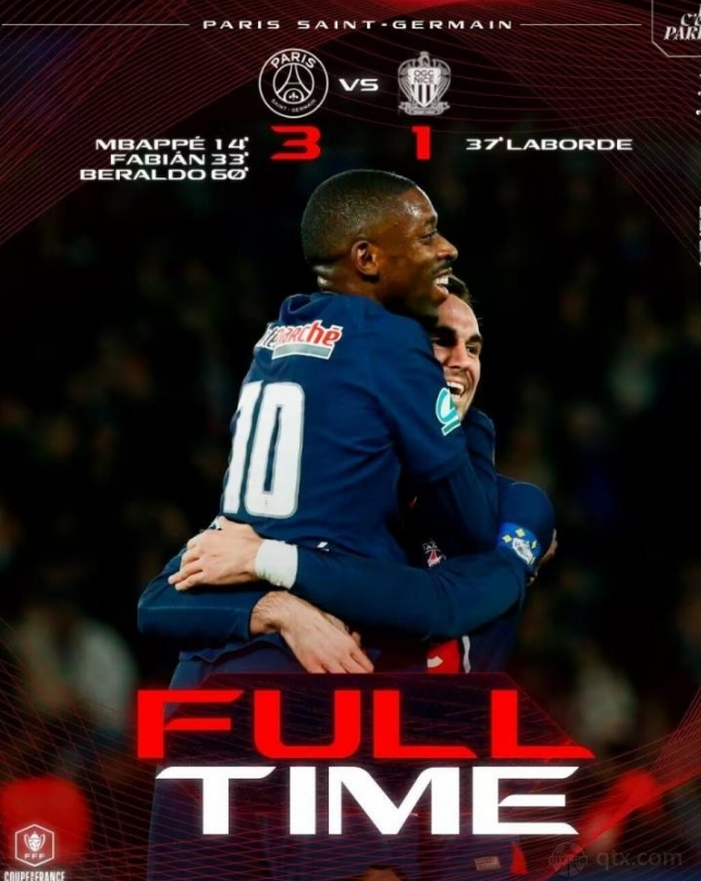 球天下3月14日訊 北京時間今日淩晨,法國杯四分之一決賽進行了一場焦點比賽,巴黎聖日耳曼坐鎮主場迎戰尼斯。在本場比賽中,巴黎聖日耳曼占據著比賽的優勢。在上半場比賽,法比安-魯伊斯禁區內將球傳給姆巴佩,後者射門得分。登貝萊搶斷對方門將,法比安-魯伊斯拿球後推射破門。巴黎聖日耳曼球員解圍失誤,拉博德拿球後射門得分。在下半場比賽中,尼斯球員禁區內射門被門將擋出,隨後射門偏出球門。巴黎聖日耳曼將球傳至禁區,丹特解圍失誤,後點的貝拉爾多頭球破門。最終,巴黎聖日耳曼3:1戰勝尼斯晉級。