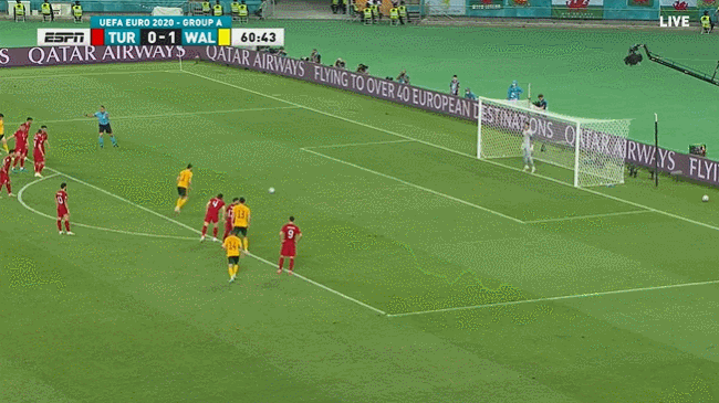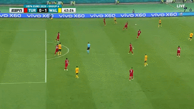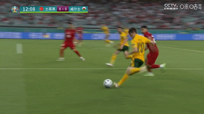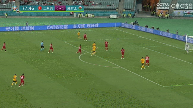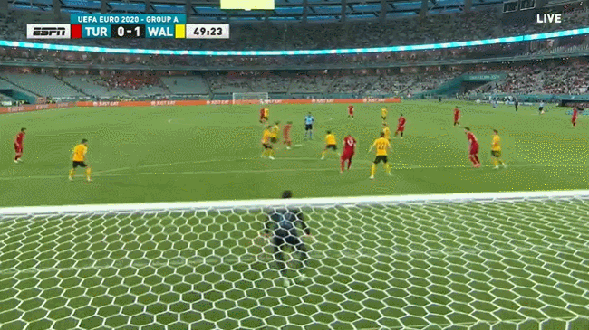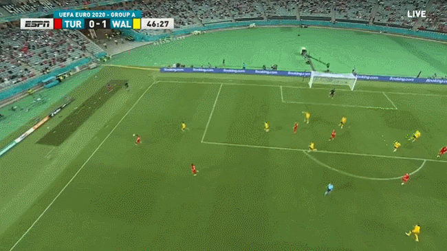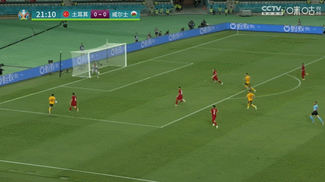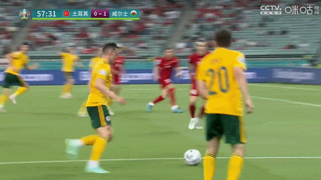 第42分鍾,貝爾前場送出精準過頂長傳,拉姆塞禁區內得球冷靜推射破門!土耳其0-1威爾士!
