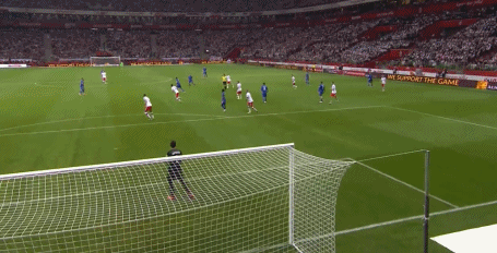 第72分鍾,沃克傳球,凱恩禁區外勁射,什琴斯尼沒能反應過來,皮球竄入球門右下角,英格蘭1-0波蘭!