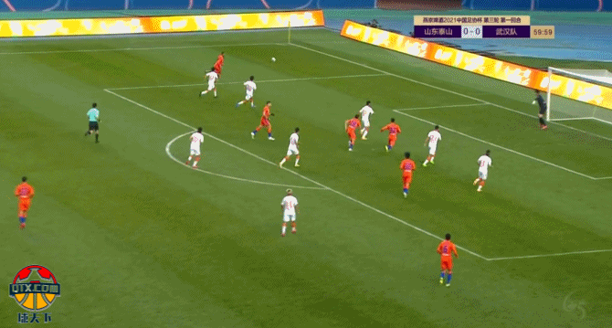 第60分鍾,宋龍挑傳德爾加多,後者左路傳中,田鑫中路殺出頭槌破門!山東泰山1-0武漢隊!