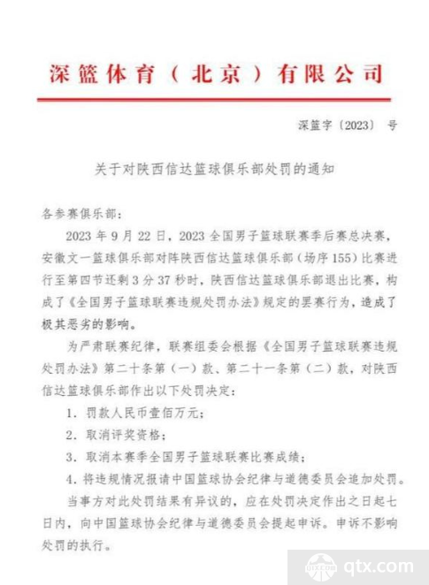 在賽事組織方,深藍體育的官方文件中,將陝西信達的行為定性為“構成了《全國男子籃球聯賽違規處罰辦法》規定的罷賽行為,造成了極其惡劣的影響。”