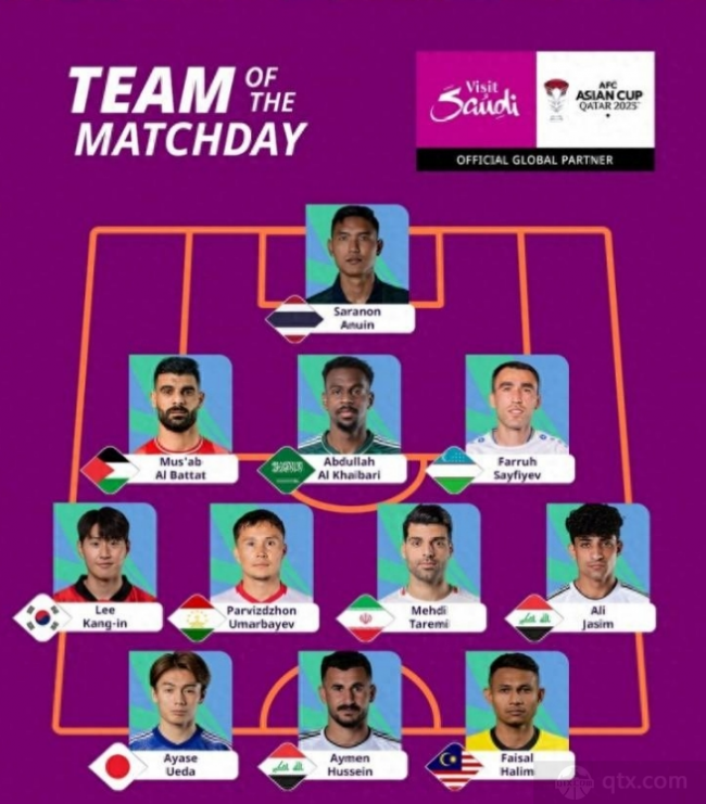 球天下1月27日訊 北京時間今日,亞足聯公布了本次亞洲杯比賽第三輪小組賽的最佳陣容。在這份陣容中,伊拉克入選人數最多,有兩名球員入選,而泰國、巴勒斯坦、沙特阿拉伯、烏茲別克斯坦、韓國、塔吉克斯坦、伊朗、日本以及馬來西亞各有一名球員入選。其中,效力於韓國的李剛仁、效力於伊朗的塔雷米以及效力於伊拉克的艾曼-侯賽因位列陣容中。