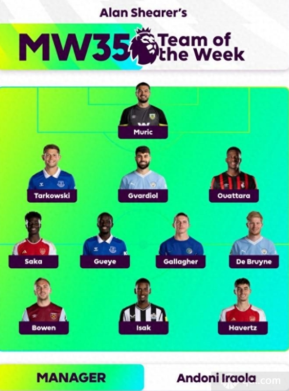 球天下4月30日訊 北京時間昨日晚間,英超聯賽官方公布了英格蘭名宿希勒評選的英超第35輪最佳陣容。在這份陣容中,阿森納、曼城與埃弗頓入選人數最多,都有3名球員入選。而切爾西、西漢姆聯、紐卡斯爾聯、伯恩利以及伯恩茅斯各有1名球員入選。在這份陣容中,效力於阿森納的德國前鋒哈弗茨、效力於紐卡斯爾聯的瑞典前鋒伊薩克以及效力於西漢姆聯的英格蘭前鋒鮑文是受到關注的球員。在主教練的位置上,希勒選擇了伯恩茅斯的主教練伊勞拉。