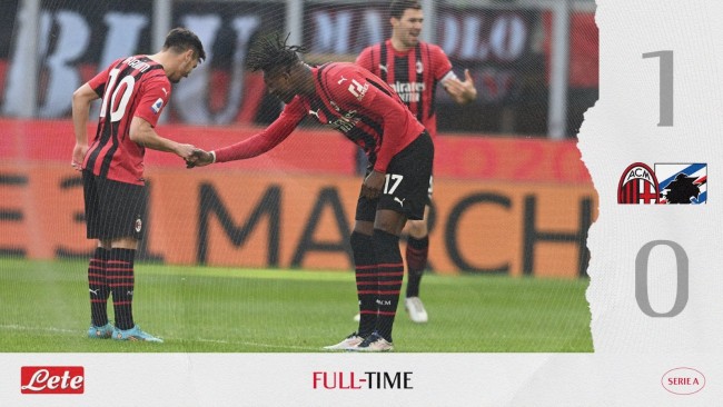 全場比賽結束,AC米蘭1-0桑普多利亞
