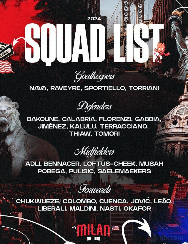 在球隊的這份大名單中,包括普利西奇、奇克、本納賽爾等多名主力都將會隨隊從意大利出發前往美國,而球隊的前鋒萊奧則將會與球隊直接在美國回合,可以說球隊的大部分主力都將隨隊參加本次美國行的比賽,AC米蘭本次球隊前往美國參加季前賽的陣容實力也是很出色的,球隊的後防、中場以及鋒線都有核心球員坐鎮,這也能很好的保證球隊的實力。