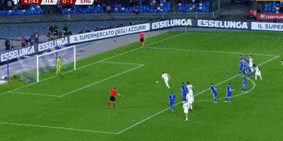 第41分鍾,迪洛倫佐防守凱恩時手球犯規,VAR回看之後,英格蘭獲得點球。
