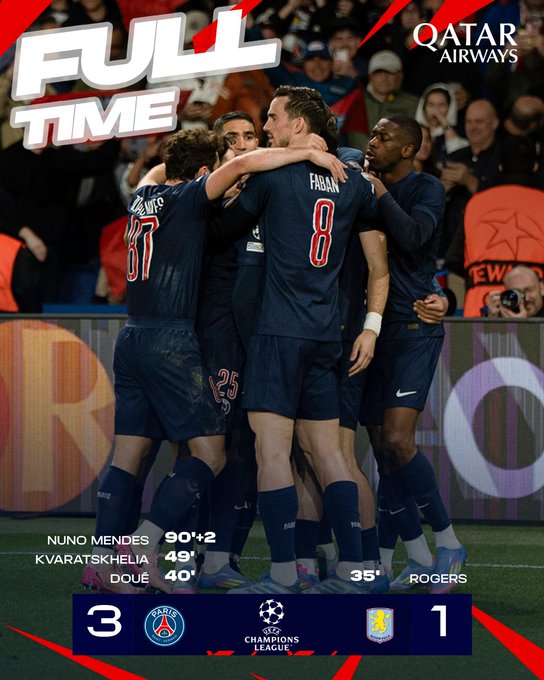 全場比賽結束,巴黎聖日耳曼3-1阿斯頓維拉。
