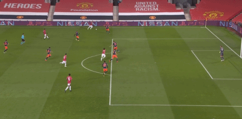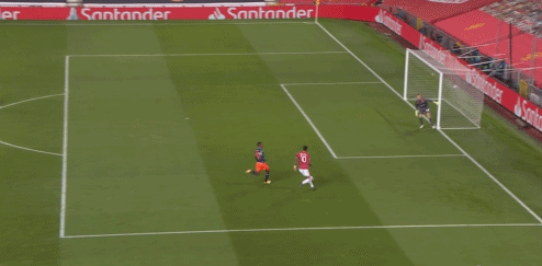 第49分鍾,曼聯前場完成搶斷之後迅速推反擊,布魯諾-費爾南德斯持球推進至禁區邊緣,將球給出右側無人盯防的卡瓦尼,但卡瓦尼拿球後第一下沒有調整好,再做調整時防守球員已經上來包抄,用身體封堵了他的射門。
